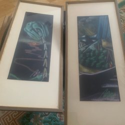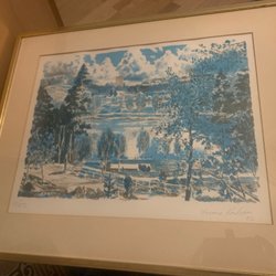 En tavla med motiv av en kvinna vid en kittel över en eld. Trä ram som har flagnat lite