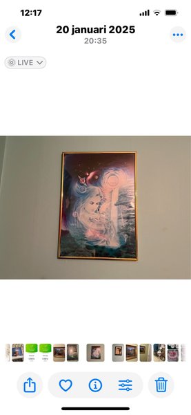 Tavla med ett motiv av en kvinna omgiven av element från naturen och rymden. Färgerna är i nyanser av blått, lila och rosa.