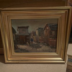 Tavla med motiv av ett landskap. Målningen är monterad i en träram. Baksidan har en etikett från Konstnär Greta Riteby, Linköping.