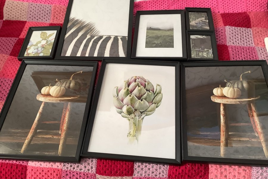 Ett set med tavlor med svarta träramar i olika storlekar. Motiven inkluderar en zebra, en kronärtskocka, blåbär, ett landskap med en lada och stilleben med pumpor.