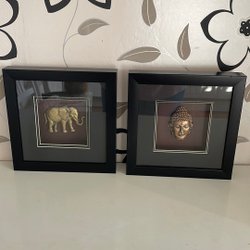 Två tavlor med Buddha-motiv. En tavla föreställer ett närbildsporträtt av Buddha i guldtoner mot en mörk bakgrund. Den andra tavlan visar en sittande Buddha-figur i gröna och lila nyanser.