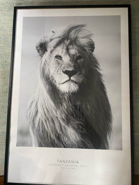 Svartvit tavla med ett lejon. Texten ”Tanzania Serengeti National Park 2°20'S 34°34'E” finns längst ner.