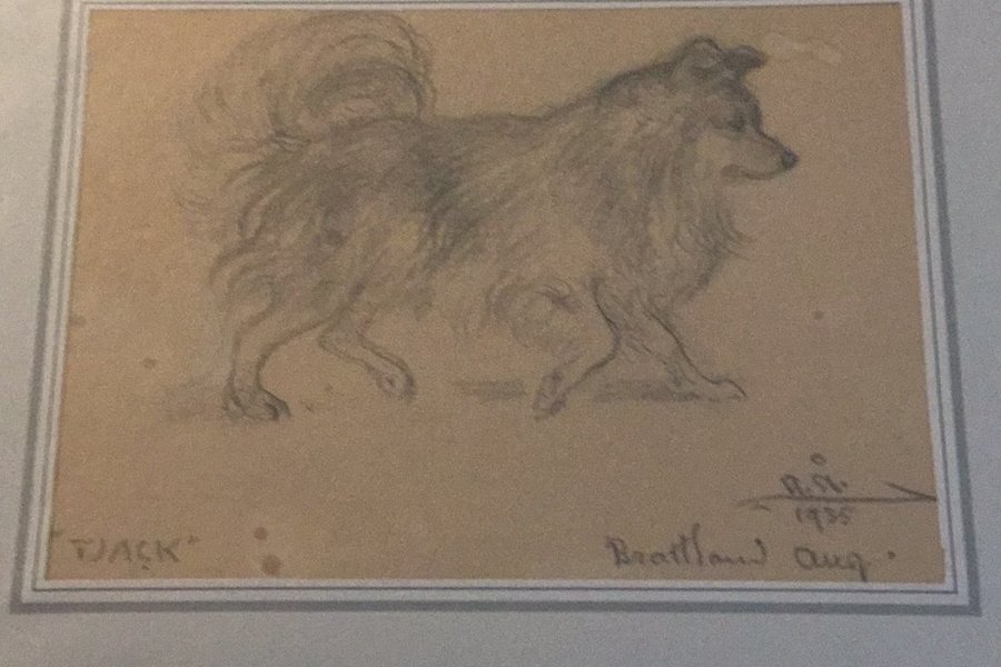 Teckning föreställande en hund. ”Tjack”. Signerad med initialer A.Å (Acke Åslund) och daterad 1935.