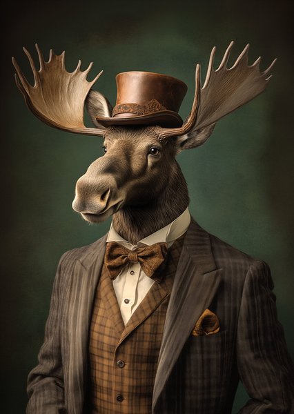 Ett elegant konsttryck som föreställer en älg i klassisk kostym.