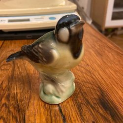 Porslinsfågel som sitter på en liten sockel.