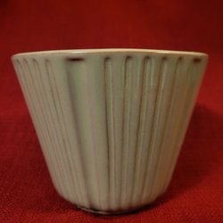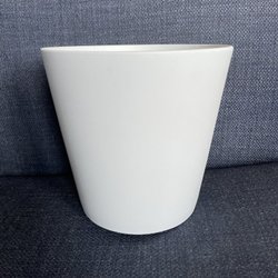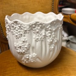 Vit blomkruka med grön dekor. Finns ett litet knappt synbart nagg på en av tassarna. Krukan är