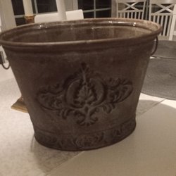 Vit kruka med ett vackert, detaljerat mönster. Höjden är cirka 20 cm och diametern upptill är ungefär 13 cm. Perfekt för dina växter!