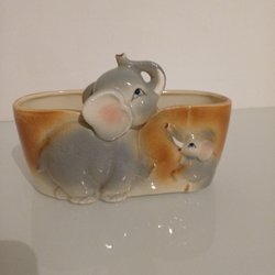Blomkruka med blommor. Ett nagg. 27 cm lång innermått uppe och 14 cm bredd innermått.