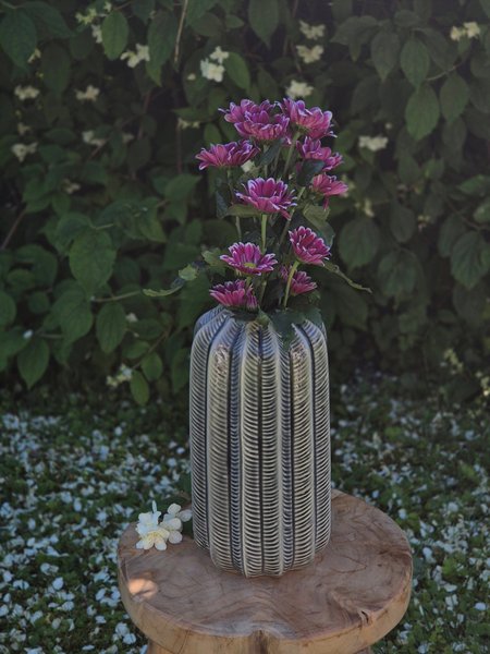 En grå vas med en räfflad, kaktusliknande struktur. Tillverkad av keramik.