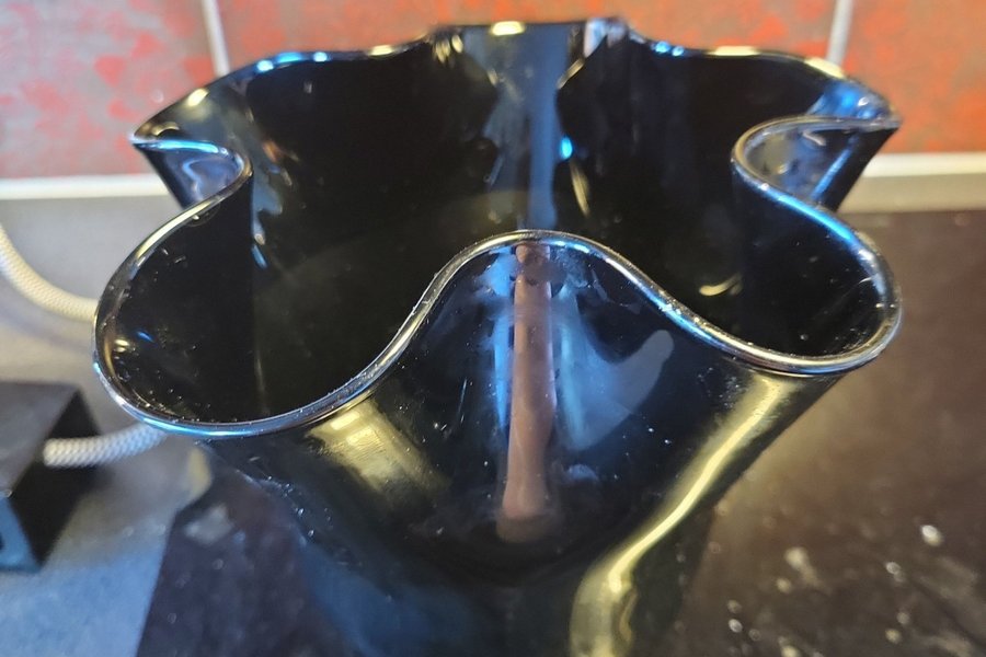 En svart vas med vågig kant.