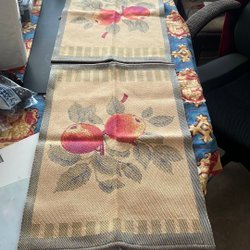 Färgerna är gula, röda och vita på ena sidan och lila, orange och blå på den andra sidan. Mått 68x46 cm