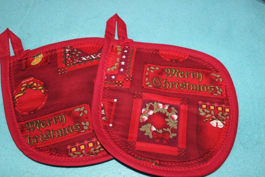 2 Välsydda grytlappar med värmeisolerande grillfoder. Baksidan i rött mixtyg. Ca 21 x 21 cm.