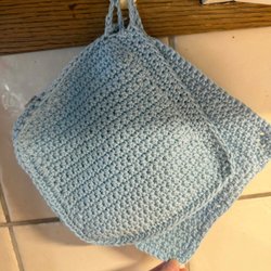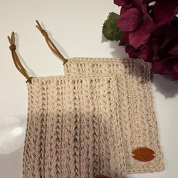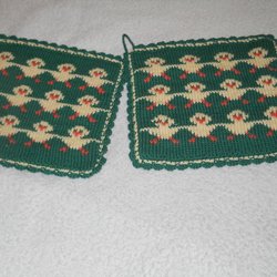 Annonsen avser ett par dvs. 2 Grytlappar som bilden visar. Grytlappens mått: ca 22 cm x ca 25 cm. Mönstrat tyg på båda sidorna.