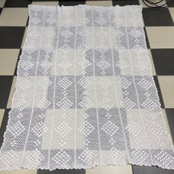 Virkat överkast eller duk i vitt dekorativt mönster.