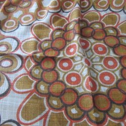 Ett tygstycke med blommönster i olika färger. Tyget är stadigt, tror ej bomull kanske polyester, ej stretch. Ca 68 x 200. Legat nerpackat länge, ej tvättat.