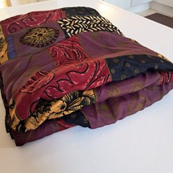 vackert tyg, ganska tunt bomull eller viskos tror jag ca 110 långt och drygt 40 brett. Färgerna klarare än på bild