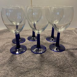 Set med 6 kaffekoppar fem assietter Kopparna och faten har ett randigt mönster i blått och vitt
