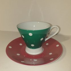 En vacker kopp med tillhörande fat. Dekorativa detaljer i guld.