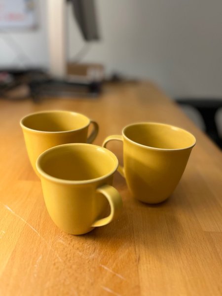 Set med tre gula muggar. Perfekta för kaffe, te eller varm choklad. Dessa muggar är ett färgglatt tillskott till varje kök.
