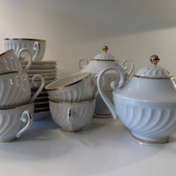 En vacker teservis med två tekannor och fyra uppsättningar av koppar med fat.