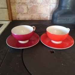 Set med koppar och fat. Två av faten har lite skav på undersidan, zooma in bilden.
