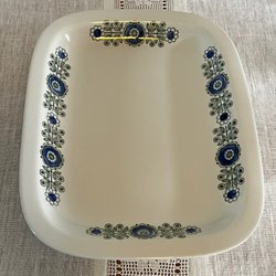 Kopparna och faten är ljusgula med ett mönster av vinröda blommor och gröna blad.