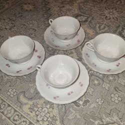 Set med 4 koppar och tillhörande fat. Kopparna är vita med ett blommönster i rosa och grönt.