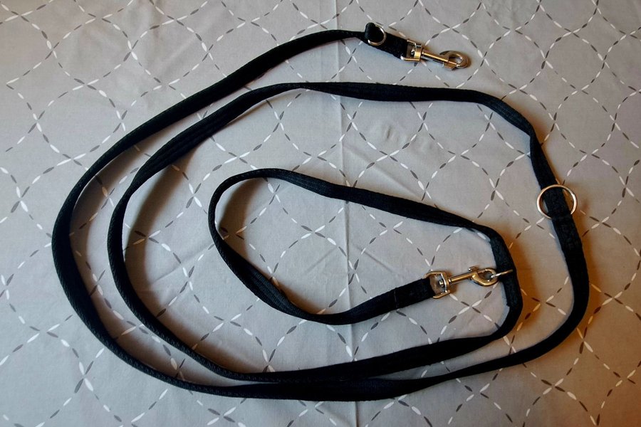 Mjukt och smidigt koppel i valkband. Det har två pistolhakar och flera ringar så att man kan justera längden. 3 m långt.