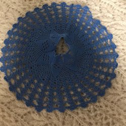 Här är en virkad, blåfärgad lampslöja Den har ett intrikat hålmönster och en vågig kant.