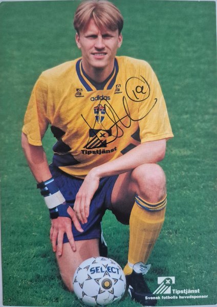 Signerat idolkort från landslaget med IFK Göteborgs-spelaren Kennet Andersson. Kortet är i fint skick.