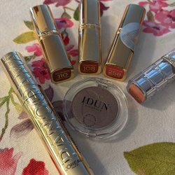 Ett paket med diverse produkter. Inkluderar bla ögonskuggspaletter från Revolution och NYX,Foundations och concealer från Idun Minerals, Milk primer ca 60% kvar.