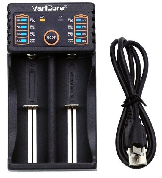 Batteriladdare från VariCore. Den kan ladda Li-ion 3.85V, Li-Fe 3.20V, Li-ion 3.70V och NIMH 1.20V batterier. Laddaren har två platser och visar laddningsstatus i procent (25%, 50%, 75%, 100%). Den har en mode knapp och kan ladda med 0.5A eller 1A. USB kabel ingår.
