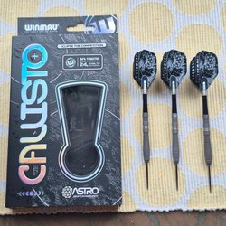 Set med tre dartpilar. Pilarna har svarta skaft och guldfärgade grepp. Fjädrarna är svarta med röda ränder och ett holografiskt mönster.
