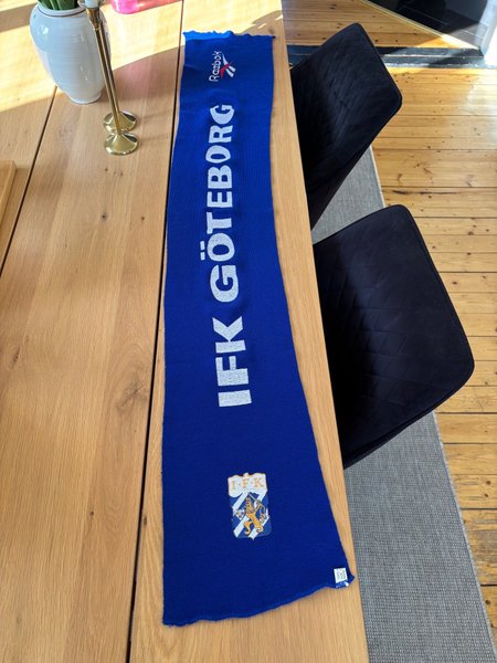 Blå halsduk med texten ”IFK GÖTEBORG” i vitt. I ena änden finns en logotyp med texten ”IFK” och ett emblem. I andra änden finns en Reebok-logotyp i vitt och rött. Okänt årtal men i mycket fint skick.