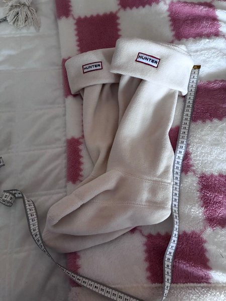Ett par Hunter stövelsockor i en ljus färg. Sockorna har en logotyp med texten "HUNTER" på ovansidan. De är designade för att ge extra värme och komfort när de bärs med stövlar.