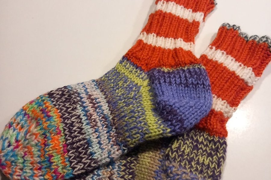 Ett par handstickade sockor med ett unikt mönster. Sockorna har en flerfärgad fot och ett orange och vitt randigt skaft. Hälarna är stickade i en kontrasterande lila färg.