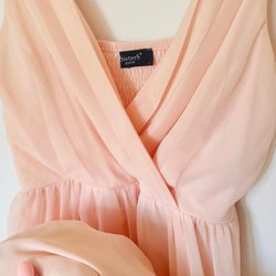 Säljer en mycket vacker puderrosa långklänning i fin design som använts vid ett tillfälle som brudtärna. Plisserad med underklänning, mycket fint fall. Urringad fram och bak. Med långa band som ska knytas runt flera varv och kunna hänga bak i en rosett exempelvis. Den är sydd framtill pga var lite för urringad på mig. Detta kan man säkert sprätta upp. Storlek är 42.