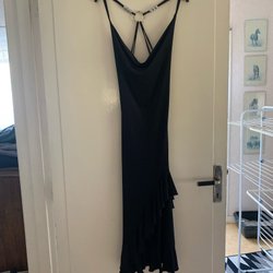 Elegant, lila aftonklänning med strassdetaljer. Klänningen har en v-ringning och smala axelband dekorerade med strass. Bysten är rynkad och markerad med ett strassband. Klänningen har en figurnära passform och en lång, böljande kjol. Specialsydd finns endast detta exemplar