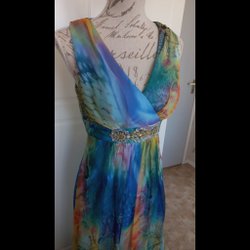 Säljer elegant klänning i en vacker blå nyans med en figurnära passform. Ungefär storlek 36, totallängd 150 cm.