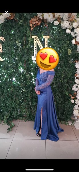 Elegant, långärmad aftonklänning i en vacker blå nyans. Klänningen har en smickrande silhuett med en elegant slits och detaljerad spets på överdelen.