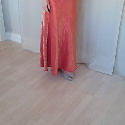 Elegant balklänning i en livfull nyans. Klänningen har en axelbandslös design med en vackert utsmyckad överdel med paljetter och pärlor. Midjan markeras av ett matchande band som knyts baktill. Kjolen faller i en A-linjeform och ger ett graciöst intryck.