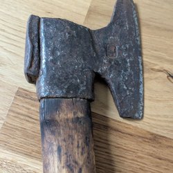 En yxa med träskaft. Märkningen på yxan är 75, 0.85 och en symbol.