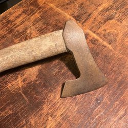 Yxa med trähandtag. Handtaget har ett mönster ingraverat. Yxhuvudet är fäst med silverfärgad tejp.