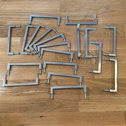 Handtag i metall (kanske aluminium) för t ex möbler, förvaringslåda, skåp eller dylikt,