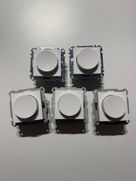 Fem stycken Schneider Exxact dimmers. Dessa dimmers är designade för att ge flexibel ljusstyrning i hemmet. De är kompatibla med Schneider Exxact-serien, vilket gör dem lämpliga för integration i befintliga installationer. Varje dimmer är en komplett enhet redo för installation.