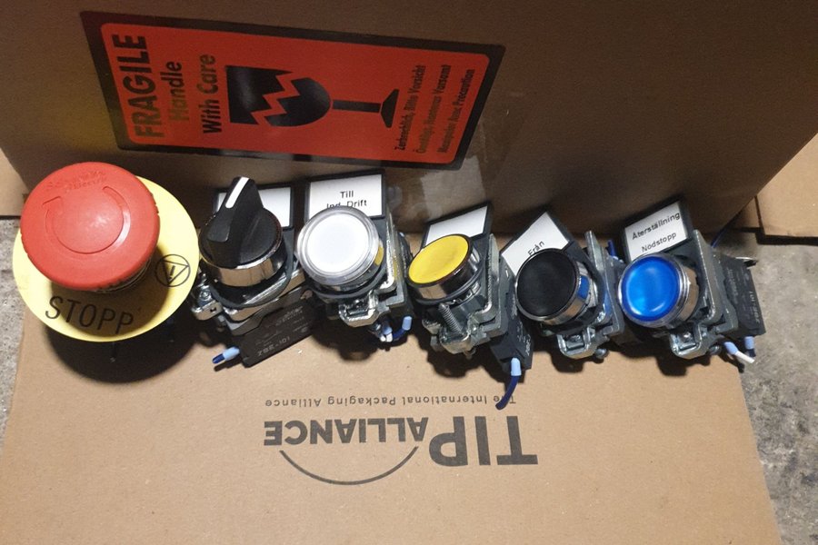Schneider Electric nödstopp med texten "STOPP" samt diverse manöverdon. Ett manöverdon har texten "Till" och "Drift", ett annat har texten "Från". Ett av manöverdonen är märkt "ZBE-101" och ett annat "78E-102".