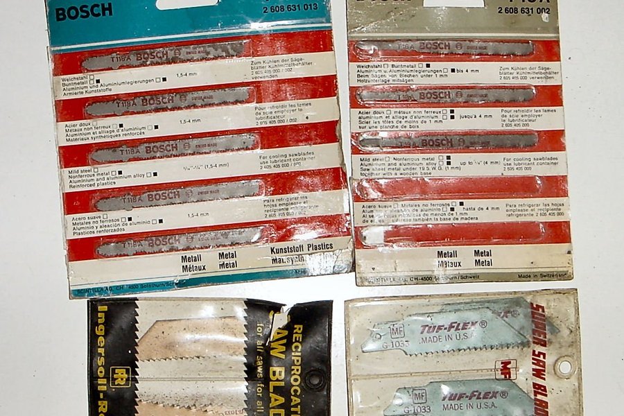 Ett parti med sågblad från Bosch, Ingersoll-Rand och Tuf-Flex. Bosch-bladen är av modell T118A och T18A, lämpliga för metall, aluminium och förstärkt plast. Ingersoll-Rand-bladen är av typen "Reciprocating Saw Blades" för allmän användning. Tuf-Flex-bladen är av modell G-1033 och G-1035, tillverkade i USA.