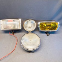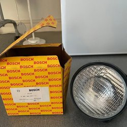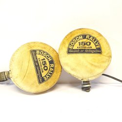 Jag ser 2 fina begagnade extraljus och 2 begagnade extraljus Ø ca 22 cm och djup ca 11,5 cm samt 8 stycken skydd "BOSCH Rallye".
