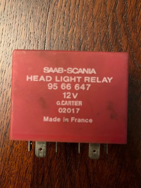 Strålkastarrelä för Saab-Scania fordon. Detta relä är märkt med artikelnummer 95 66 647 står Saab 9000 96 på! Från fyndlåda funktion osäker.