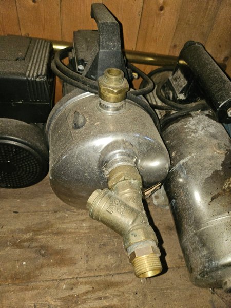 Vattenpump i metall med handtag. Pumpen har anslutningar i mässing, varav en är märkt "DN20".